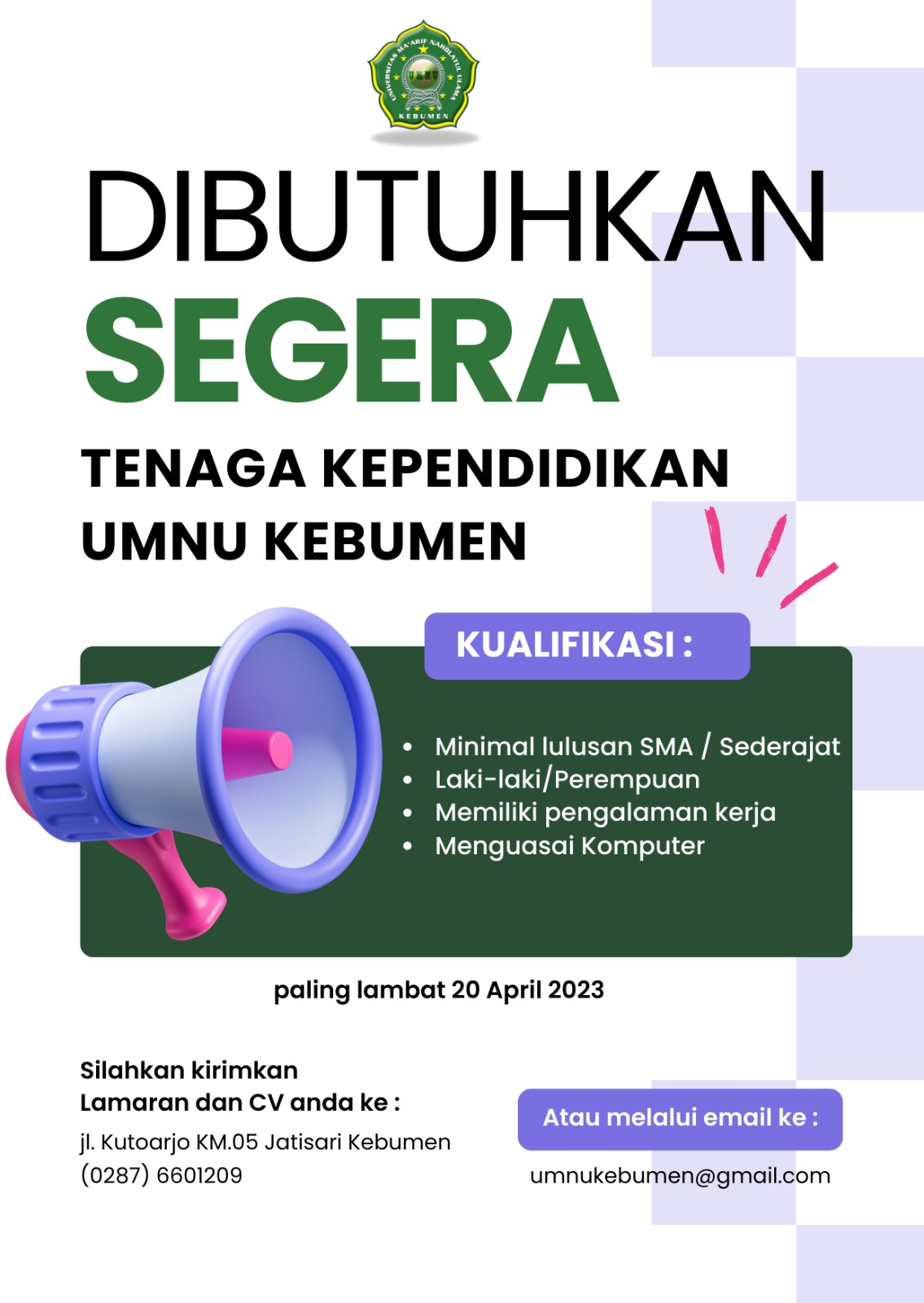 BeritaPengumumanINFO LOWONGAN PEKERJAAN TENDIK UMNU KEBUMEN admin_umnu_jatisari3 years ago2 years ago01 min Post navigation Previous: Peraturan Pegawai UMNUNext: Berani Bersinar: Pembinaan Mahasiswa KIP Kuliah UMNU Kebumen Menuju Puncak Prestasi